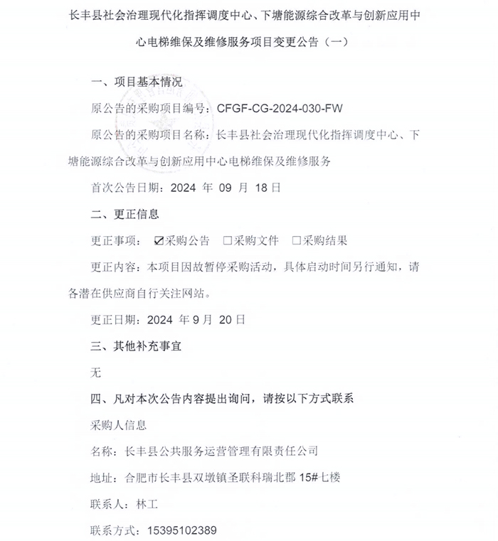 長豐縣社會(huì)治理現(xiàn)代化指揮調(diào)度中心、下塘能源綜合改革與創(chuàng)新應(yīng)用中心電梯維保及維修服務(wù)項(xiàng)目變更公告(一)
