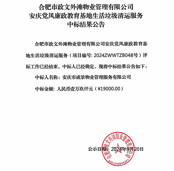 合肥市政文外灘物業(yè)管理有限公司安慶黨風廉政教育基地生活垃圾清運服務中標結(jié)果公告