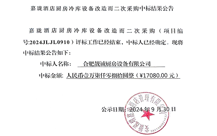 嘉瓏酒店客房部與餐飲廚房雜件二次采購中標(biāo)結(jié)果公告