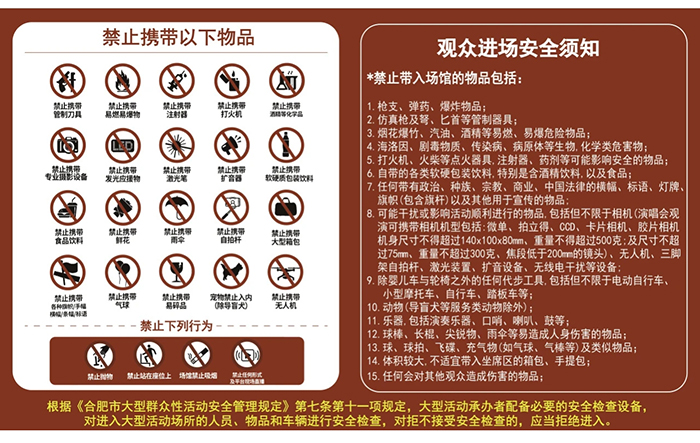 觀演須知本次演唱會為實名制購票,請各位觀眾不要通過非官方渠道購票,以免造成不必要的損失。所有入場觀眾須持門票及身份證經(jīng)安檢后方可入內(nèi)。演出現(xiàn)場禁止攜帶:1.槍支、彈藥、爆炸物品;2.仿真槍及弩、匕首等管制器具;3.煙花爆竹、汽油、酒精等易燃、易爆危險物品;4.海洛因、劇毒物質(zhì)、傳染病、病原體等生物,化學類危害物質(zhì);5.打火機、火柴等點火器具,注射器、藥劑等可能影響安全的物品;6.玻璃瓶/杯、保溫杯、冰盒、奶瓶等易碎品與各類容器;7.自帶的各類軟硬包裝飲料,特別是含酒精飲料,以及食品;8.任何橫幅、標語、燈牌、旗幟(包含旗桿)以及其他用于宣傳的物品,以及任何材質(zhì)的應援物均禁止帶入場內(nèi),包括但不限于藝人燈牌、旗幟手幅、巨型照片、人牌、橫幅等應援物。9.不限于未經(jīng)授權的專業(yè)相機,可能干擾或影響活動順利進行的物品,包括但不限于相機(演唱會觀演可攜帶相機機型包括:微單、拍立得、CCD、卡片相機、膠片相機機身尺寸不得超過140x100x80mm、重量不得超過500克;及尺寸不超過75mm、重量不超過300克、焦段低于200mm的鏡頭)、無人機、三腳架自拍桿、激光裝置、擴音設備、無線電干擾等設備;10.除嬰兒車與輪椅之外的任何代步工具,包括但不限于電動自行車、小型摩托車、自行車、踏板車等;11.動物(導盲犬等服務類動物除外);12.樂器,包括演奏樂器、口哨、喇叭、鼓等;13.球棒、長棍、尖銳物、雨傘等易造成人身傷害的物品;14.球、球拍、飛碟、充氣物(如氣球、氣棒等)及類似物品;15.體積較大,不適宜帶入坐席區(qū)的箱包、手提包;16.任何會對其他觀眾造成傷害的物品;*嚴禁攜帶國家法律法規(guī)明令禁止的其它物品或安檢搜爆警力認為與活動現(xiàn)場功能不符、明顯影響安全的其它物品進場。