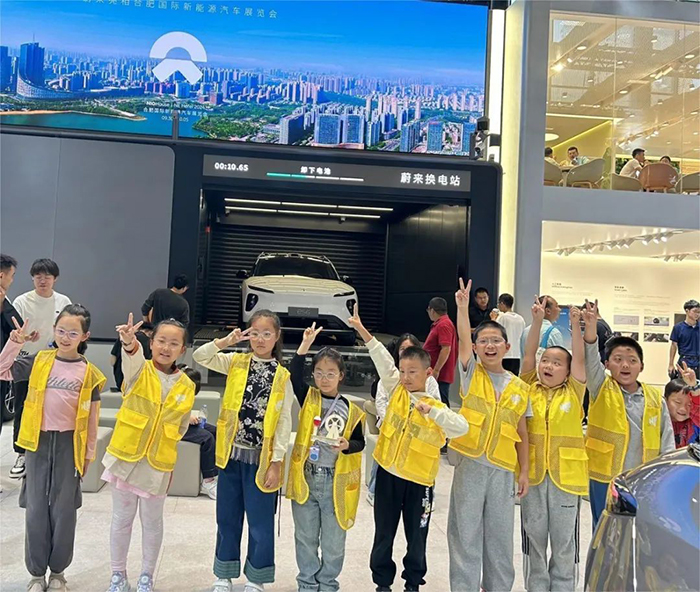 跟隨研學(xué)導(dǎo)師小朋友進(jìn)入車(chē)展現(xiàn)場(chǎng)化身小小偵探家了解“霸都”合肥如何成為新能源汽車(chē)之都化身小小工程師親手制作手搖發(fā)電機(jī)進(jìn)入蔚來(lái)展區(qū),化身小小記者探秘全鋁車(chē)身的鉚接技術(shù)智能化RGV立體庫(kù)以及全自動(dòng)智能設(shè)備和創(chuàng)新工藝等蔚來(lái)黑科技