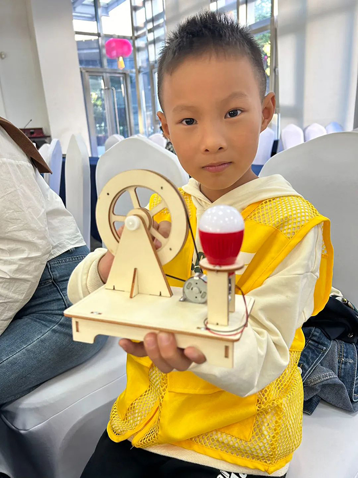 小朋友們轉(zhuǎn)身變成小小工程師,在研學(xué)導(dǎo)師的演示下,把發(fā)電機(jī)模型拼起來(lái),用小手搖啊搖,“咻”的一聲,動(dòng)能變成了電能,小燈泡亮了,小朋友的好奇心也被點(diǎn)燃了。