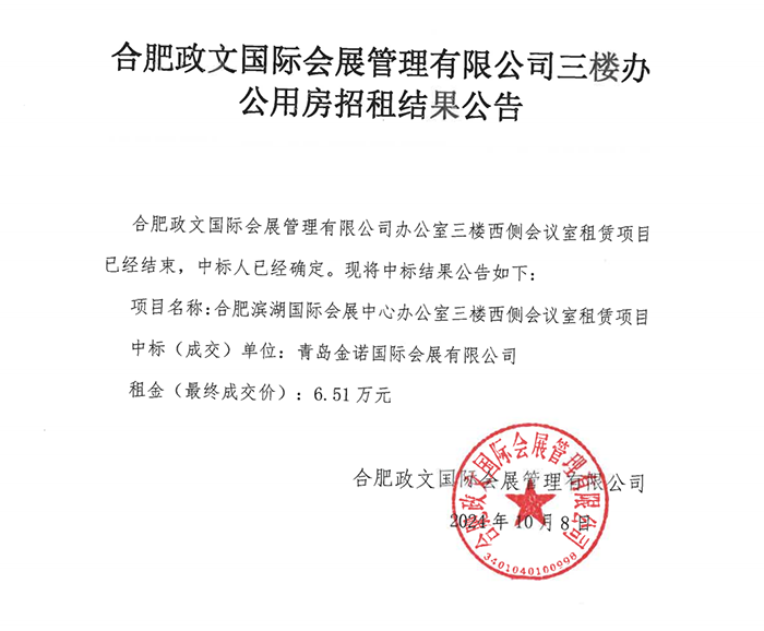 合肥政文國際會(huì)展管理有限公司三樓辦公用房招租結(jié)果公告