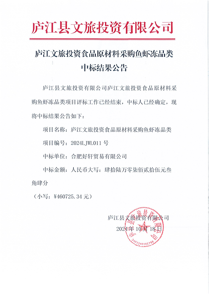 廬江文旅投資食品原材料采購魚蝦凍品類中標(biāo)結(jié)果公告