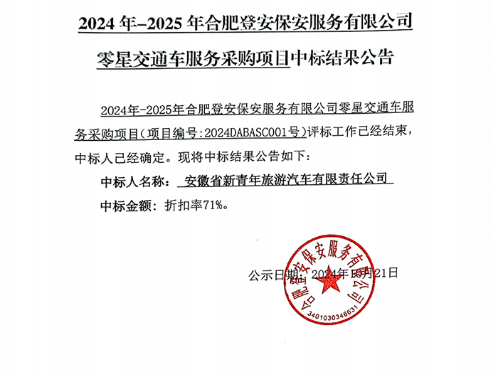 2024年-2025年合肥登安保安服務(wù)有限公司零星交通車服務(wù)采購項目中標(biāo)結(jié)果公告