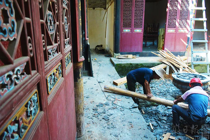 6月18日,工人們?cè)诎矐c市岳西縣響腸鎮(zhèn)修繕古建筑。吳均奇 攝