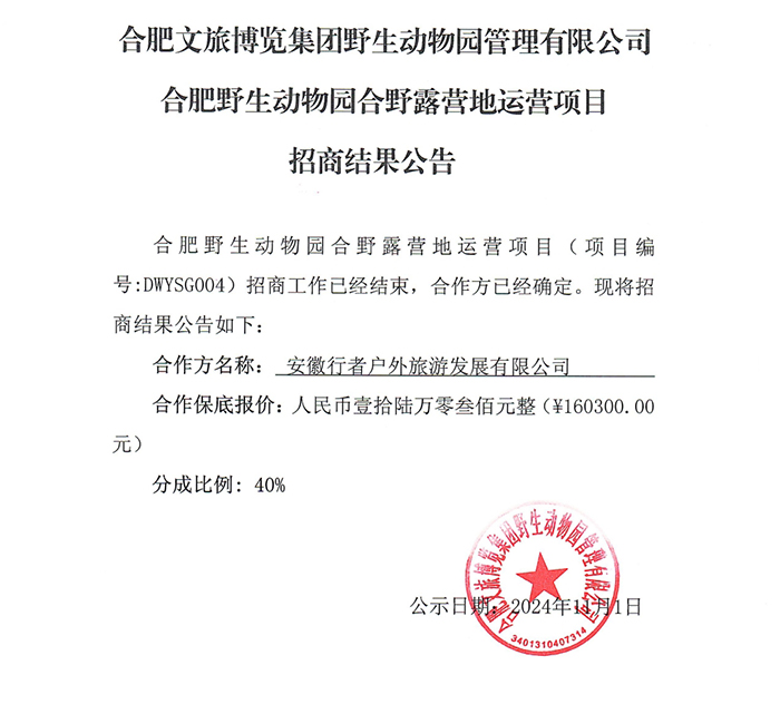 合肥文旅博覽集團(tuán)野生動物園管理有限公司合肥野生動物園合野露營地運營項目招商結(jié)果公告
