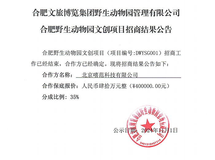 合肥文旅博覽集團(tuán)野生動(dòng)物園管理有限公司合肥野生動(dòng)物園文創(chuàng)項(xiàng)目招商結(jié)果公告