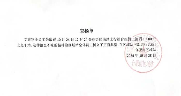 同樣是在10月24日,軌道交通5號線項目合肥南站的保潔員朱敏,在站臺座椅上撿到了15000元現金。面對這筆意外之財,她沒有絲毫貪念,而是主動上交至車站。合肥南區(qū)域站對朱敏拾金不昧的精神給予了高度評價。在文旅軌道物業(yè),這樣的好人好事早已屢見不鮮。從項目維修工周東生在休寧路撿拾到手機,到保潔員楊紅英、夏杏花在各自站點撿拾到手機并上交,這些看似微不足道的舉動,卻猶如一面鏡子,映射出的是一個集體的高尚品格。