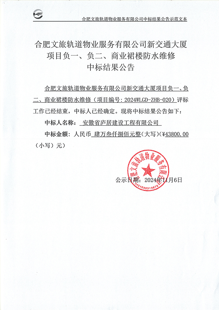 合肥文旅軌道物業(yè)服務(wù)有限公司新交通大廈項(xiàng)目負(fù)一、負(fù)二、商業(yè)裙樓防水維修中標(biāo)結(jié)果公告