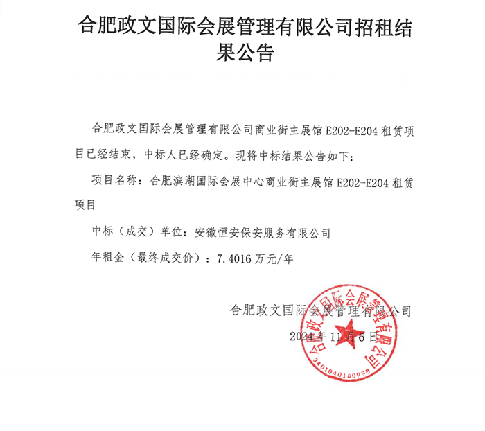 合肥政文國際會展管理有限公司招租結(jié)果公告