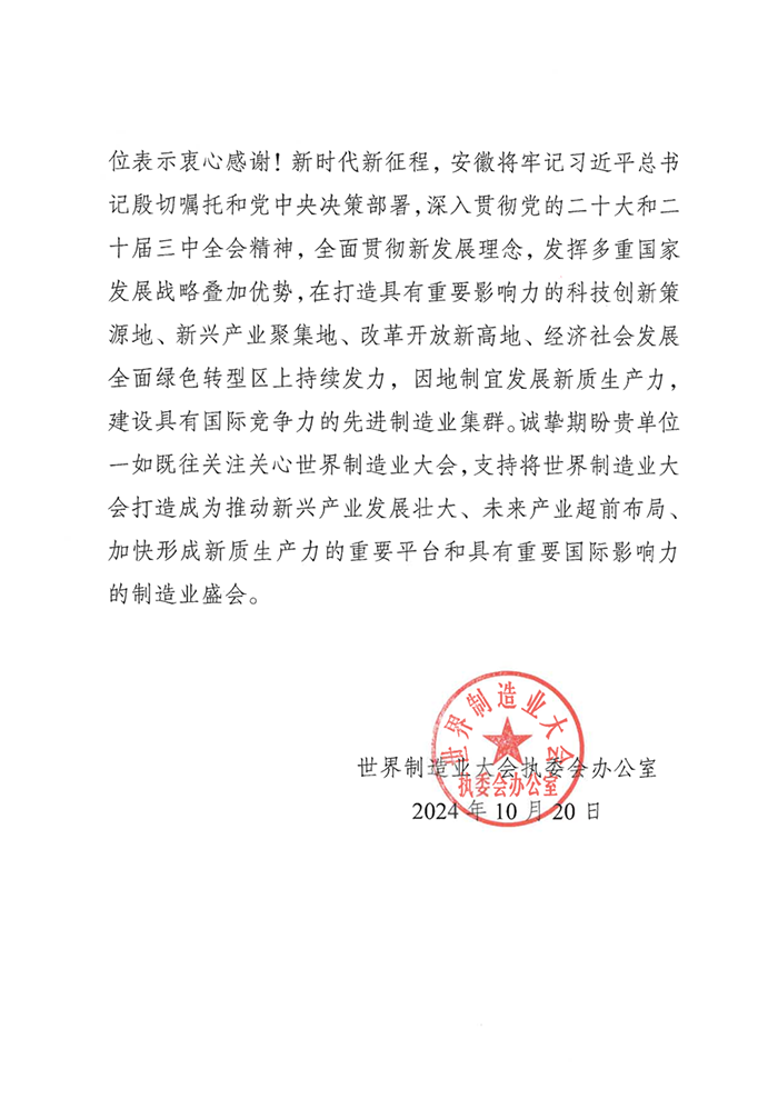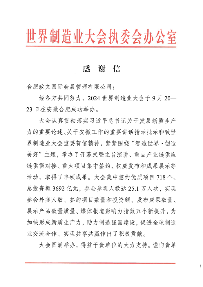 世界制造業(yè)大會執(zhí)委會辦公室向政文會展發(fā)來一封感謝信