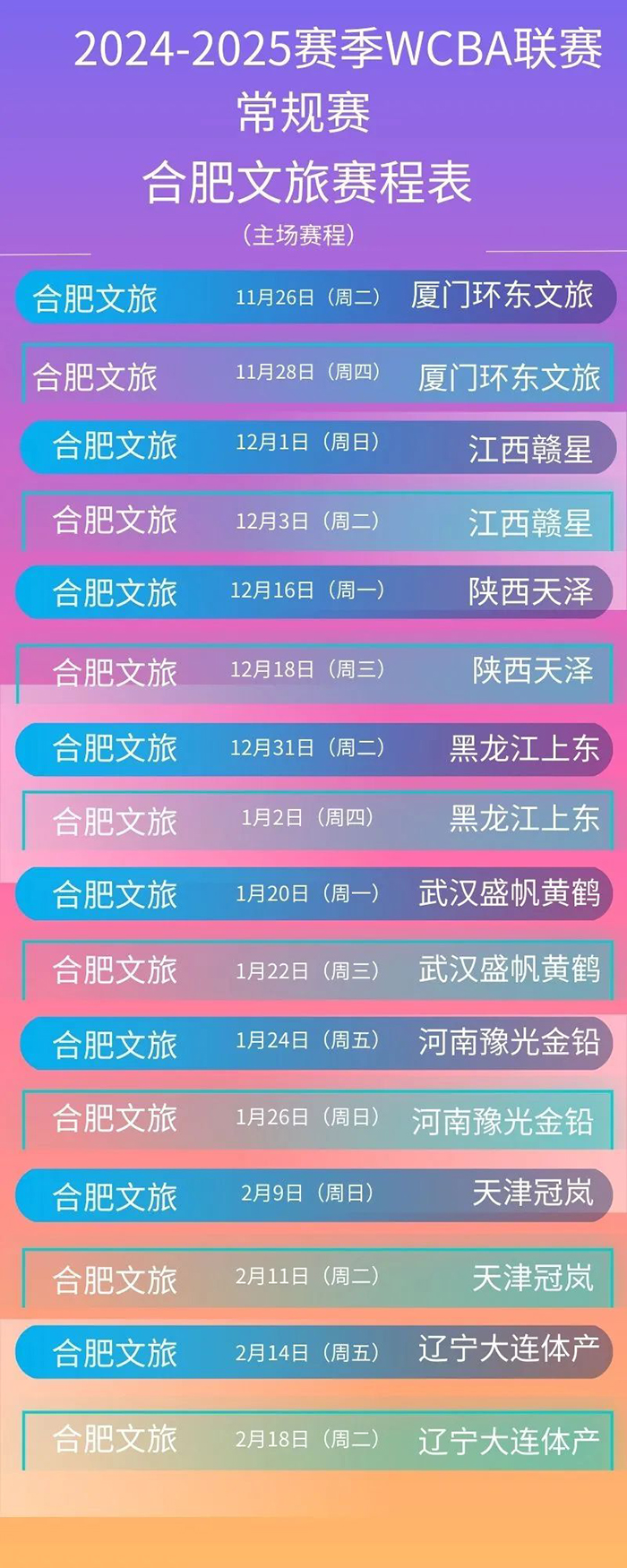 新賽季的首場比賽,合肥文旅將于11月16日赴客場挑戰(zhàn)黑龍江上東女籃,而合肥文旅的首個主場比賽定于11月26日坐鎮(zhèn)合肥體育中心體育館迎來廈門環(huán)東文旅女籃。