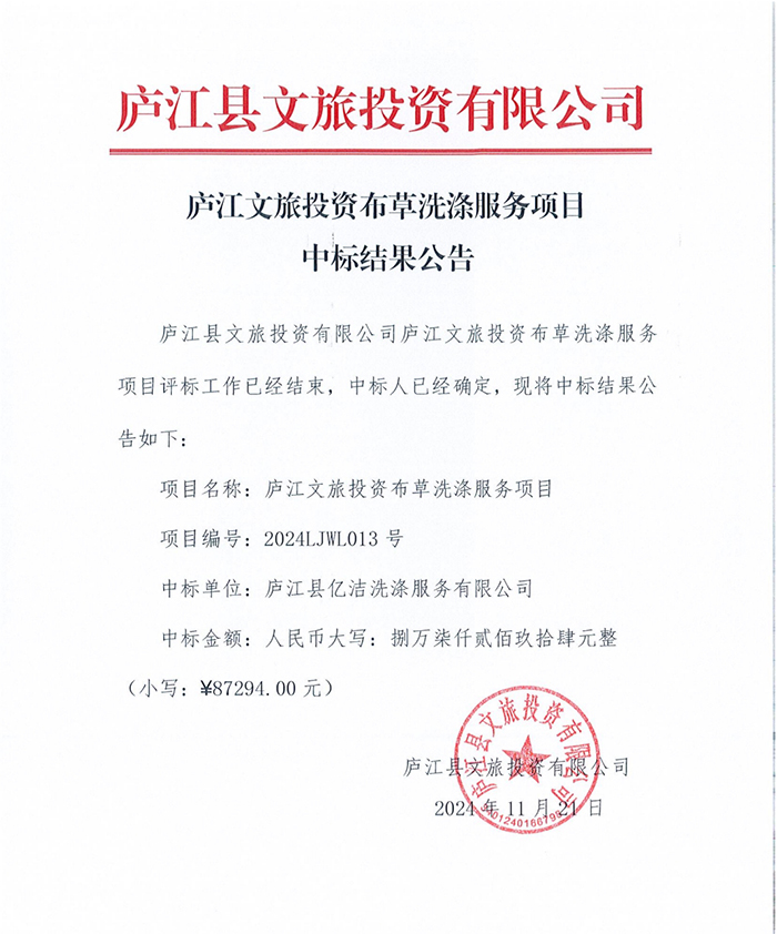 廬江文旅投資布草洗滌服務項目中標結(jié)果公告