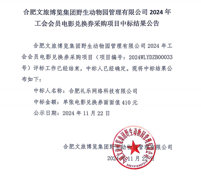 合肥文旅博覽集團(tuán)野生動物園管理有限公司2024年工會會員電影兌換券采購項(xiàng)目中標(biāo)結(jié)果公告
