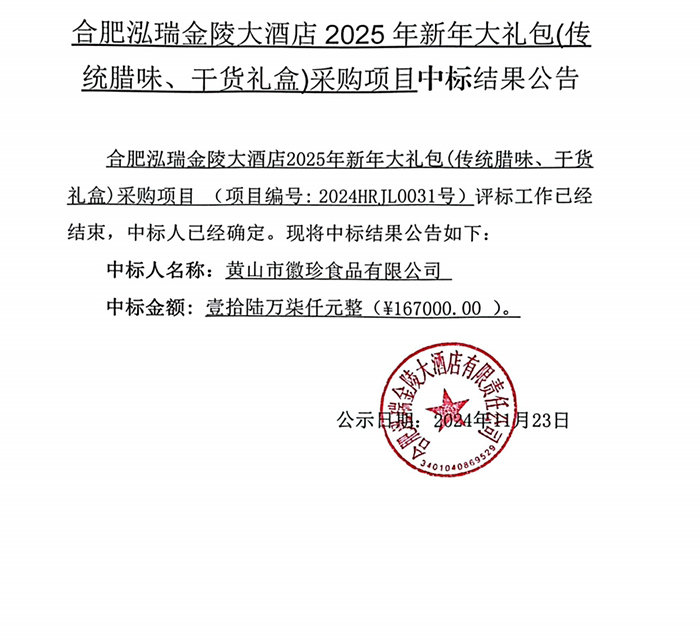 合肥泓瑞金陵大酒店2025 年新年大禮包(傳統(tǒng)臘味、干貨禮盒)采購項目中標結果公告
