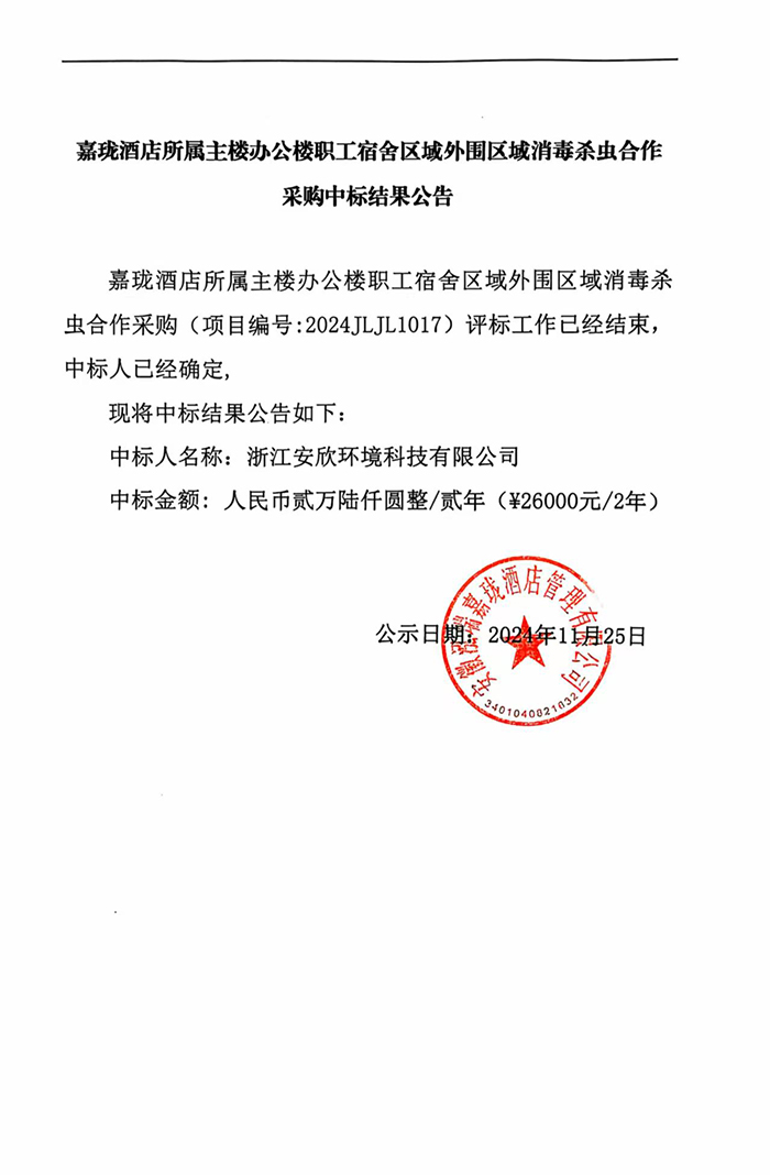 嘉瓏酒店所屬主樓辦公樓職工宿舍區(qū)城外圍區(qū)城消毒殺蟲合作采購中標結(jié)果公告