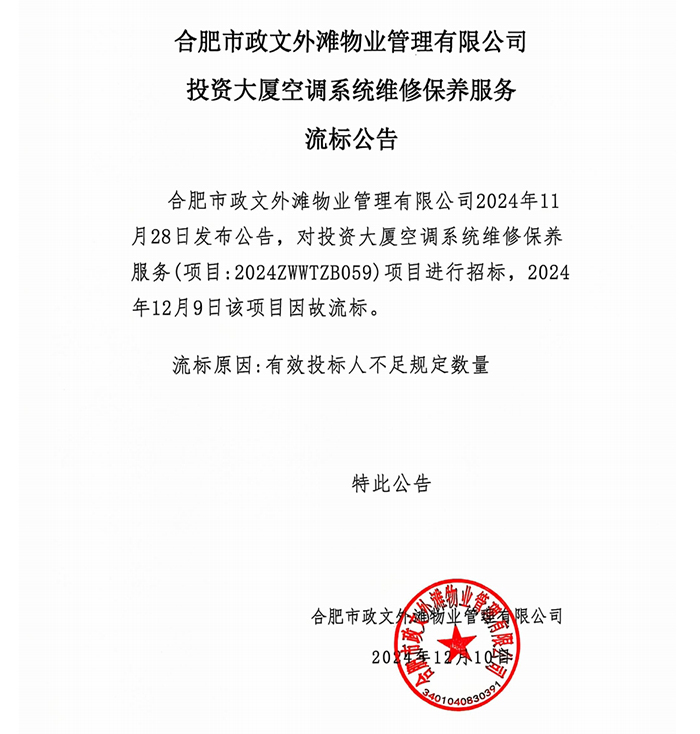 合肥市政文外灘物業(yè)管理有限公司投資大廈空調(diào)系統(tǒng)維修保養(yǎng)服務流標公告