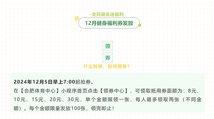使用如何使用健身抵用券?1、領(lǐng)券當(dāng)月有效:健身福利券領(lǐng)取后當(dāng)月有效,可在【合肥體育中心】小程序購票或訂場時使用本券抵扣。2、滿減補(bǔ)差:訂單金額需等于或大于券面金額,全面金額不足需補(bǔ)差價(jià),每個訂單限用一張券。3、優(yōu)惠同享:本券可與會員儲值折扣同享。4、【晨運(yùn)票】【老年證】【優(yōu)待證】等不再享用抵扣券。5、使用有效期:本期發(fā)放的健身福利券,使用有效期于2024年12月31日截止,過期作廢。