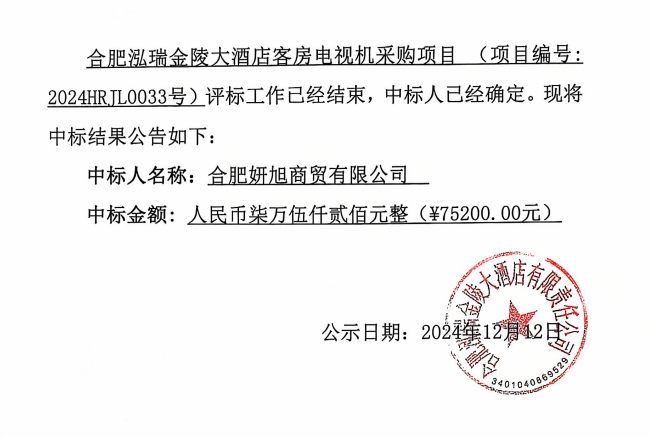 合肥泓瑞金陵大酒店客房電視機采購項目中標結果公告