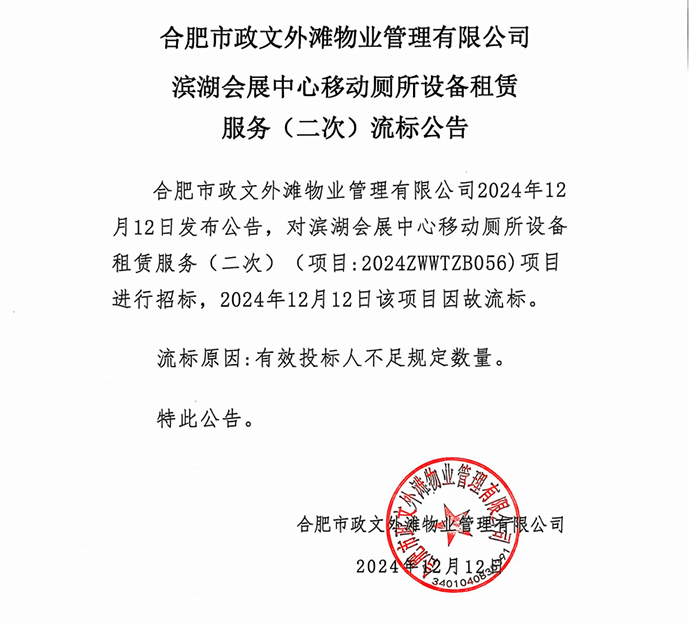 合肥市政文外灘物業(yè)管理有限公司濱湖會展中心移動(dòng)廁所設(shè)備租賃服務(wù)(二次)流標(biāo)公告