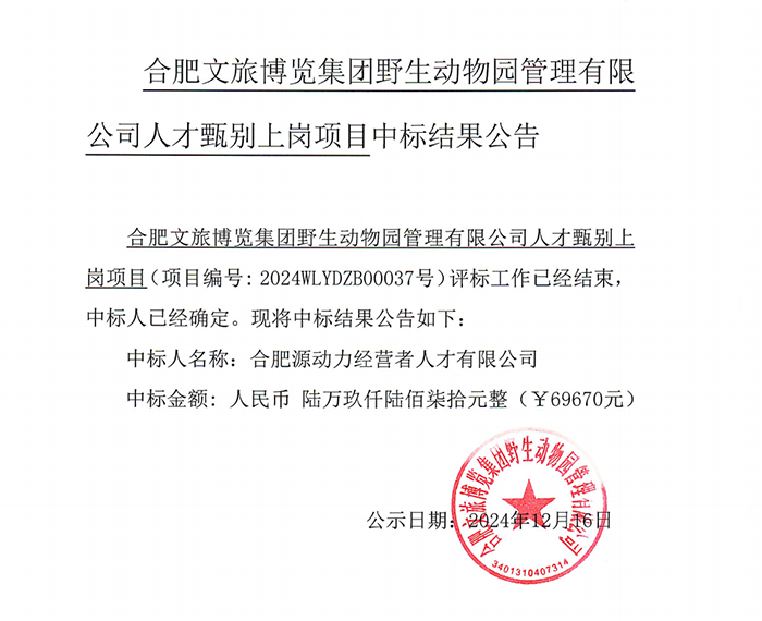 合肥文旅博覽集團(tuán)野生動(dòng)物園管理有限公司人才甄別上崗項(xiàng)目中標(biāo)結(jié)果公告