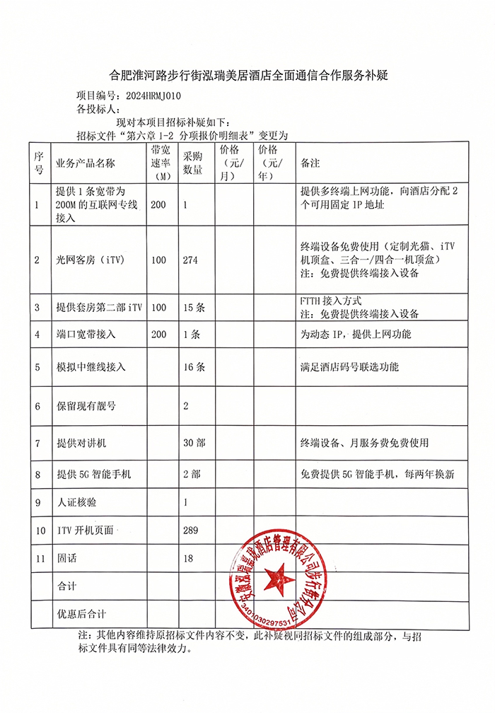 合肥淮河路步行街泓瑞美居酒店全面通信合作服務(wù)補疑