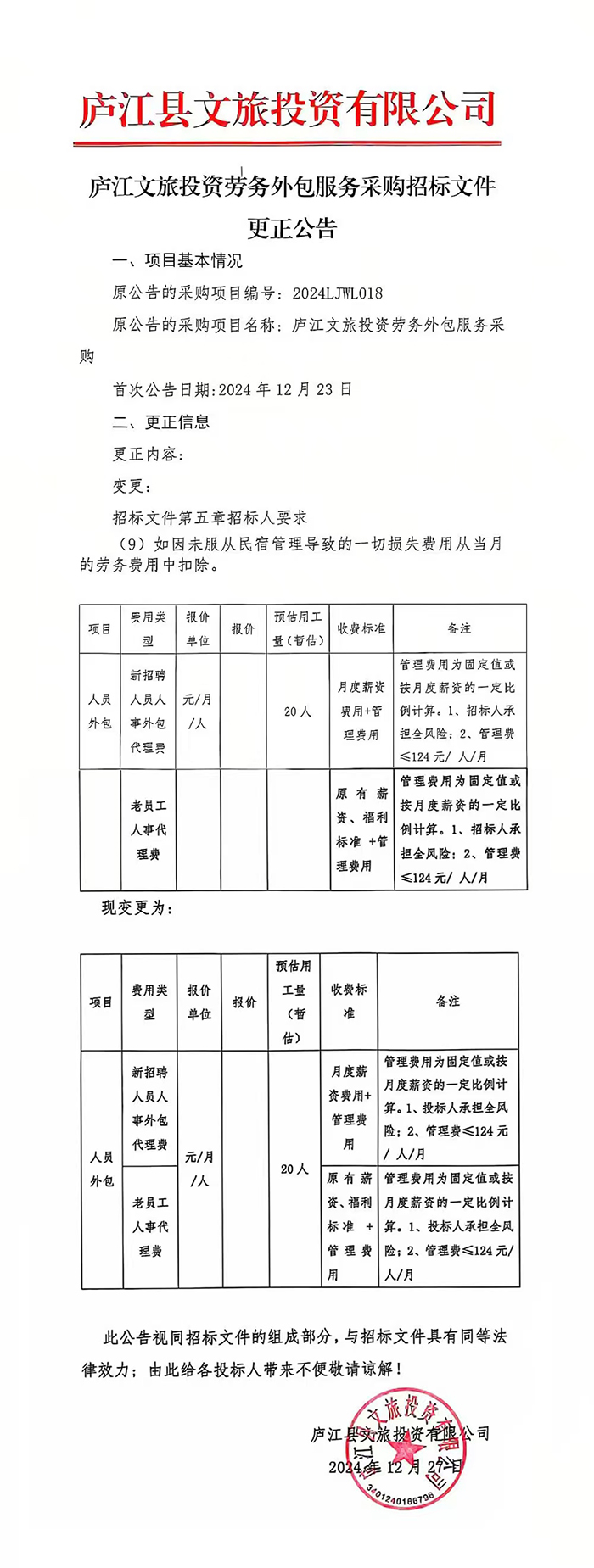 廬江文旅投資勞務外包服務采購招標文件更正公告