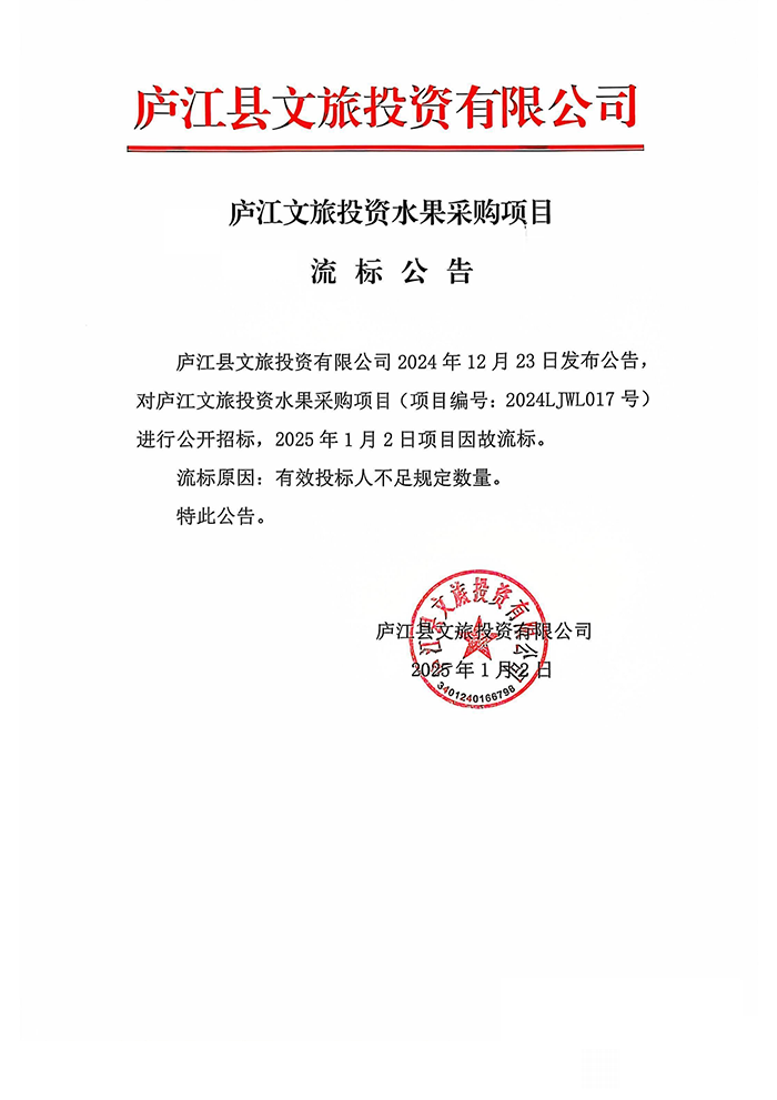 廬江文旅投資水果采購(gòu)項(xiàng)目流標(biāo)公告