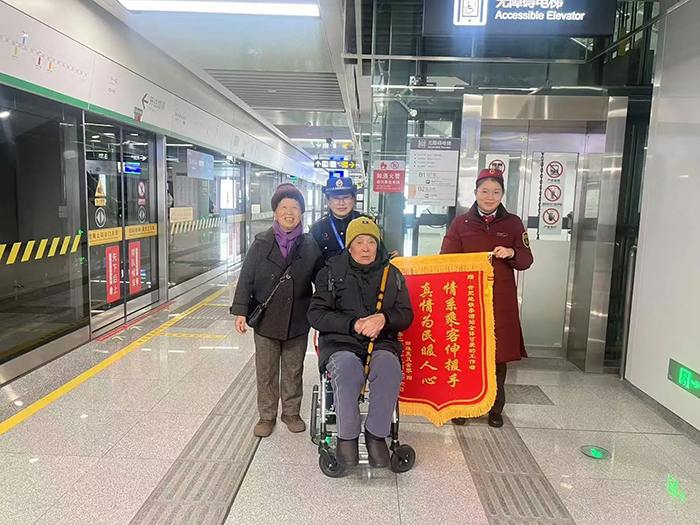 2024年12月28日,安醫(yī)一附院南區(qū)站與李灣站被一股濃濃的溫情所包圍。兩名老年乘客,其中一位行動不便,坐著輪椅,帶著滿滿的感激之情,分別向這兩個站點贈送了錦旗,每一面錦旗都承載著一段深情厚誼。