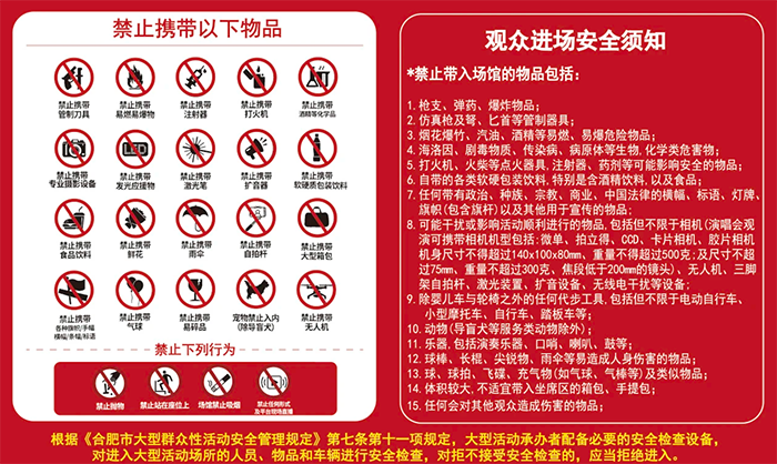 現(xiàn)場(chǎng)禁止攜帶物品清單:(實(shí)際以現(xiàn)場(chǎng)安檢為準(zhǔn))一、禁止攜帶的危險(xiǎn)品、管制品1、武器類危檢品:槍支、軍械、警械、管制刀具等。2、爆炸類危險(xiǎn)品:彈藥、爆破器材、煙火制品等。3、液態(tài)/氣態(tài)危險(xiǎn)品:易燃易爆液體氣體、腐蝕性液體等。4、含有違反法律和社會(huì)公德內(nèi)容的宣傳品。二、禁止攜帶的限制類物品1、大尺寸箱包及玩偶玩具:大行李箱(超過(guò)55*35厘米)、人偶玩具等,貴重物品自行保存。2、金屬和玻璃等硬質(zhì)水杯,瓶裝罐裝飲料,非密封食品。3、火種:火絨、火柴、打火棒、打火機(jī)等。4、激光產(chǎn)品:激光指向器、激光測(cè)距器等。5、一般刀具:水果刀、剪刀、菜刀、廚刀、工具用刀等。6、各類易造成人身傷害的棍棒及尖銳物品、長(zhǎng)桿:自拍桿、木桿、竹桿、金屬桿、雨傘(太陽(yáng)傘)等。球、球拍、飛碟及類似物品。因疾病需要使用的手杖、拐杖除外。7、無(wú)人飛行器:無(wú)人機(jī)、無(wú)人氣球、已充入氣體的氣球等。8、專業(yè)攝影器材:任何未經(jīng)授權(quán)的專業(yè)攝影攝像設(shè)備及用于照相機(jī)、攝像機(jī)的三角支架、獨(dú)角架、音視集直播設(shè)備等。具有拍照、提像功能的手機(jī)除外。9、帶有政治、種族、宗教、暴恐以及商業(yè)內(nèi)容的橫幅、標(biāo)語(yǔ)以及其它用于宣傳的物品。10、擴(kuò)音設(shè)備:樂(lè)器、口哨、喇叭、鼓等各類擴(kuò)音器具。11、國(guó)家法律法規(guī)明令禁止的其它物品或安檢搜爆警力認(rèn)為與活動(dòng)現(xiàn)場(chǎng)功能不符、明顯影響安全的其它物品。