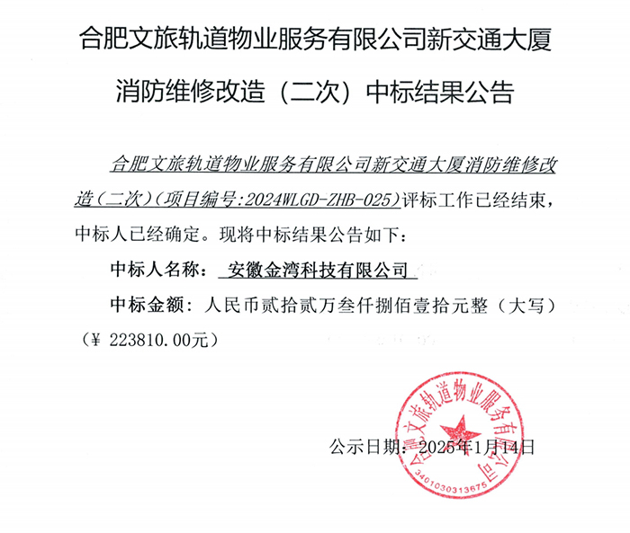 合肥文旅軌道物業(yè)服務(wù)有限公司新交通大廈消防維修改造(二次)中標(biāo)結(jié)果公告