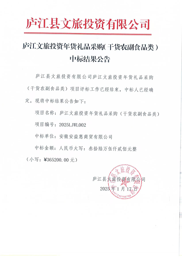 廬江文旅投資年貨禮品采購(千貨農(nóng)副食品類)中標(biāo)結(jié)果公告