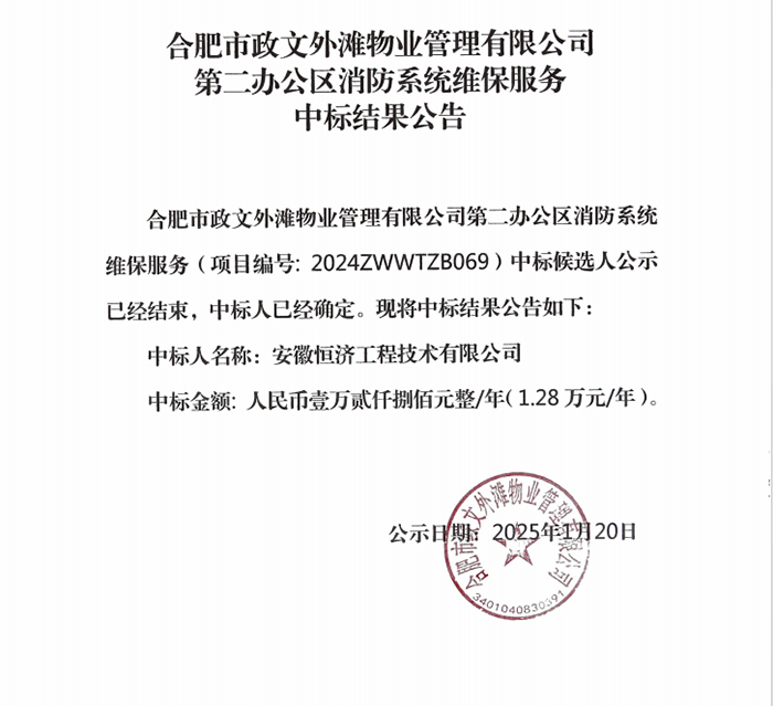合肥市政文外灘物業(yè)管理有限公司第二辦公區(qū)消防系統(tǒng)維保服務(wù)中標(biāo)結(jié)果公告