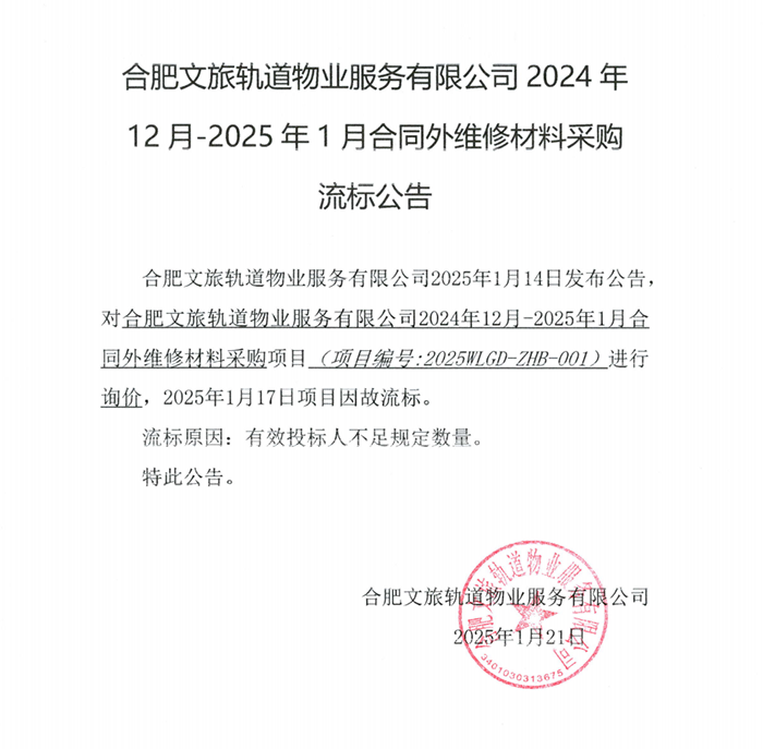 合肥文旅軌道物業(yè)服務(wù)有限公司 2024 年 12月-2025 年1月合同外維修材料采購(gòu) 流標(biāo)公告