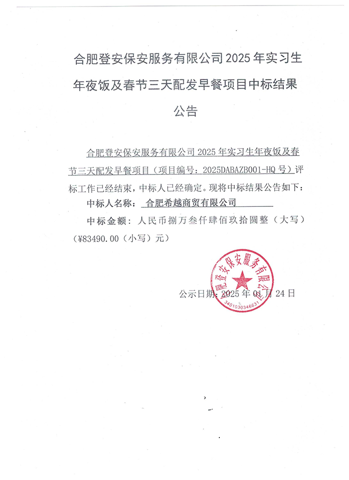 合肥登安保安服務(wù)有限公司 2025 年實(shí)習(xí)生年夜飯及春節(jié)三天配發(fā)早餐項(xiàng)目中標(biāo)結(jié)果公告