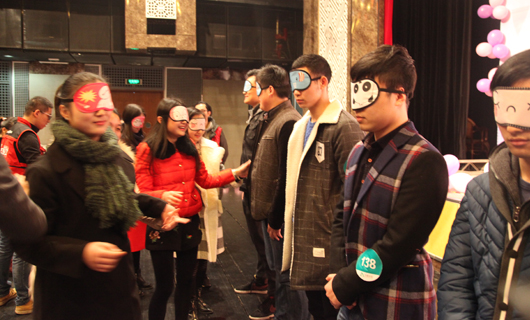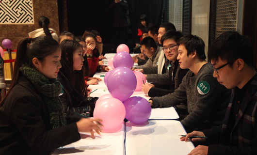 下午14:00,活動(dòng)正式開(kāi)始,全體互動(dòng)游戲擊鼓傳花把場(chǎng)內(nèi)氣氛推向一個(gè)小高潮。一共3輪的擊鼓傳花不僅帶動(dòng)了現(xiàn)場(chǎng)氣氛,也讓數(shù)位嘉賓上臺(tái)進(jìn)行了自我介紹,表演了才藝,引來(lái)陣陣掌聲和歡笑。經(jīng)過(guò)數(shù)輪熱身活動(dòng)后,開(kāi)始主題活動(dòng)“五覺(jué)體驗(yàn)”。10對(duì)男女嘉賓上臺(tái),經(jīng)過(guò)“嗅覺(jué)”選取心儀對(duì)象,通過(guò)“觸覺(jué)”一起走過(guò)障礙物,再由“味覺(jué)”互喂糖果,“視覺(jué)”畫(huà)出彼此心目中的男神女神,最后由“聽(tīng)覺(jué)”去深入了解。讓一對(duì)對(duì)俊男靚女從陌生走向熟悉,活動(dòng)中穿插的互動(dòng)游戲“踩氣球”與“五覺(jué)體驗(yàn)”一起把活動(dòng)推向了最高潮。在“視覺(jué)”過(guò)程中,主持人挑選12對(duì)嘉賓上臺(tái)進(jìn)行對(duì)戰(zhàn),兩人一組并在腿上綁上氣球,場(chǎng)面熱烈,笑聲掌聲不斷。16:30,活動(dòng)在抱抱團(tuán)的全場(chǎng)互動(dòng)及幸運(yùn)大抽獎(jiǎng)的現(xiàn)場(chǎng)表白中圓滿(mǎn)結(jié)束。