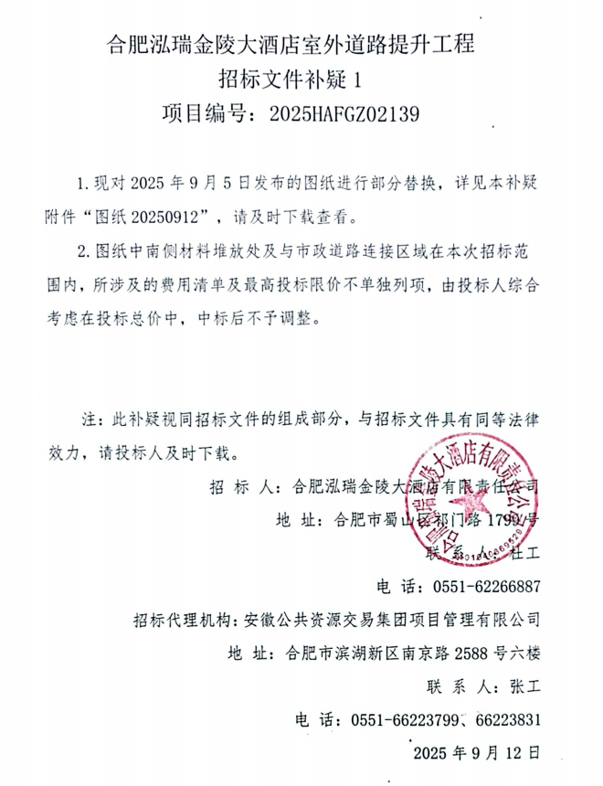 合肥泓瑞金陵大酒店室外道路提升工程招標(biāo)文件補(bǔ)疑1