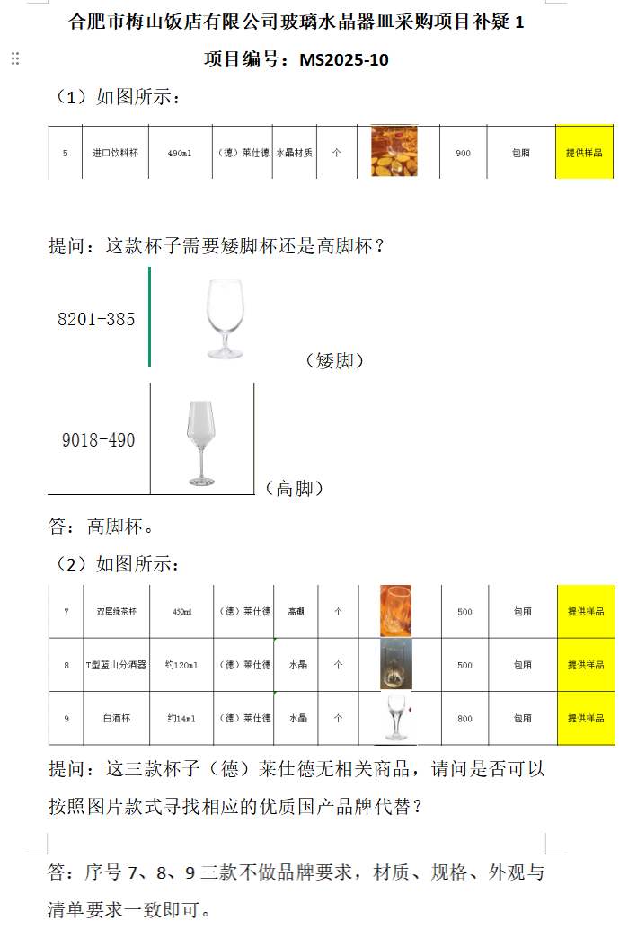 合肥市梅山飯店有限公司玻璃水晶器皿采購項(xiàng)目補(bǔ)疑1