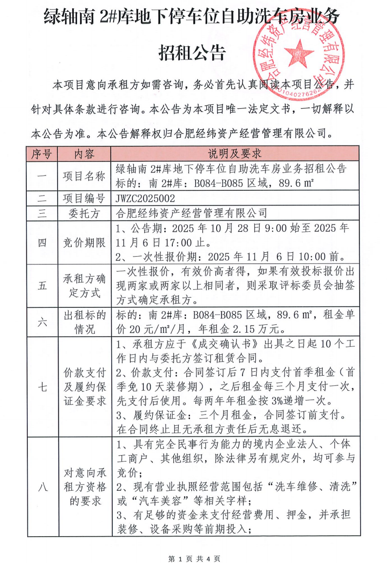 綠軸南2#庫地下停車位自助洗車房業(yè)務(wù)招租公告