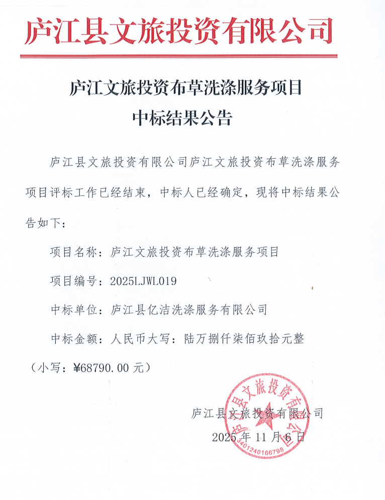 廬江文旅投資布草洗滌服務項目中標結果公告