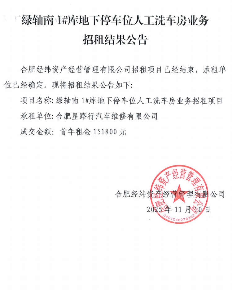綠軸南1#庫(kù)地下停車位人工洗車房業(yè)務(wù)招租結(jié)果公告