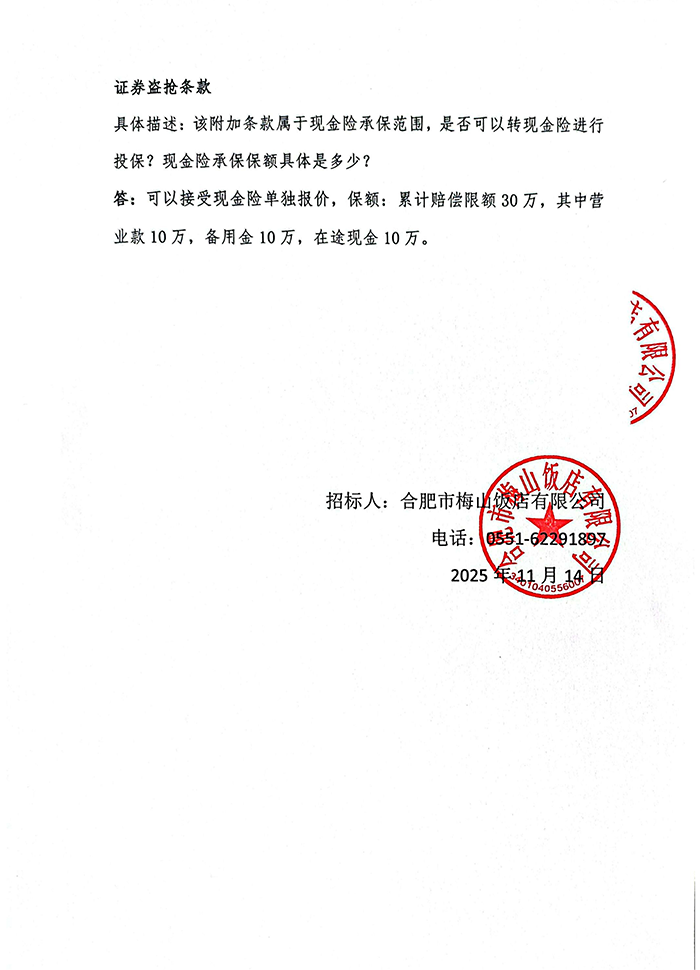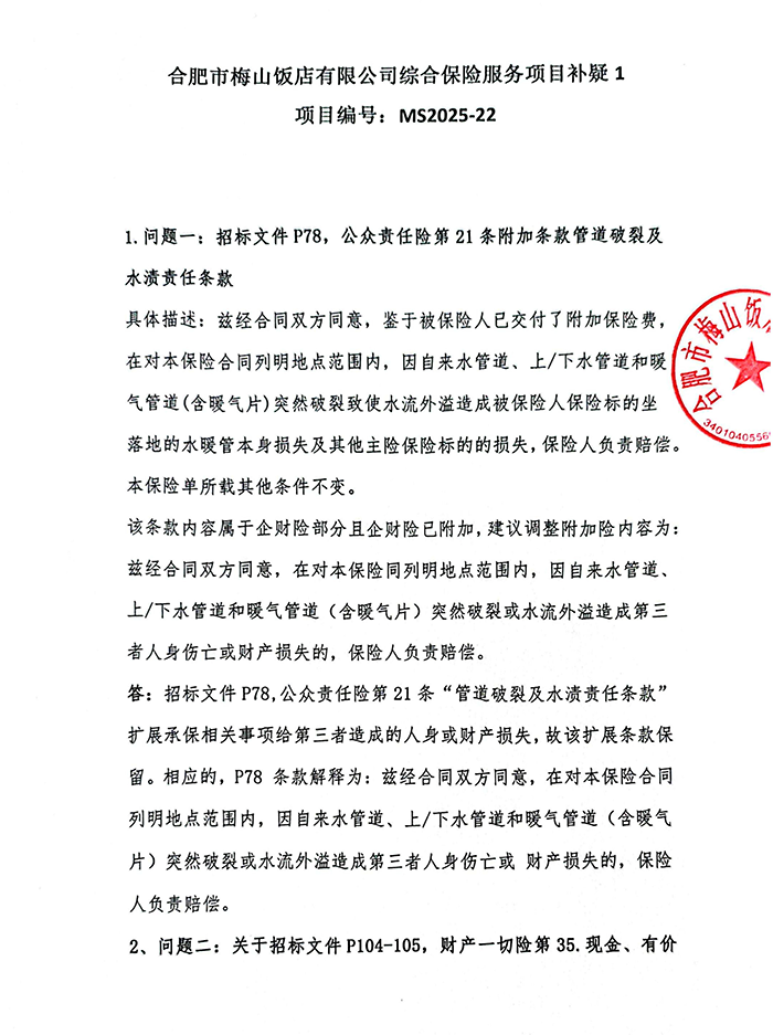 合肥市梅山飯店有限公司綜合保險(xiǎn)服務(wù)項(xiàng)目補(bǔ)疑 1