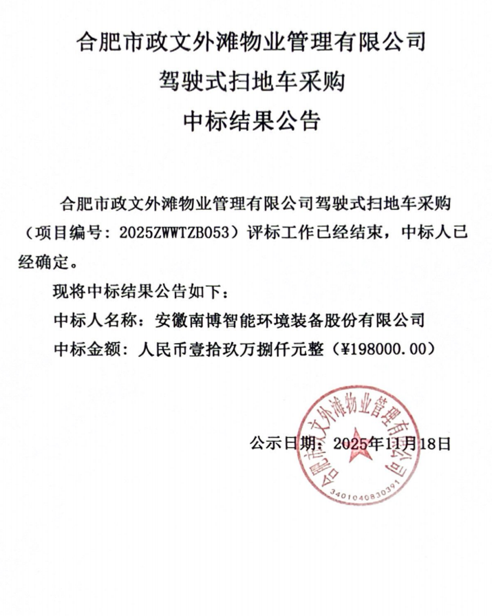 合肥市政文外灘物業(yè)管理有限公司駕駛式掃地車采購中標(biāo)結(jié)果公告