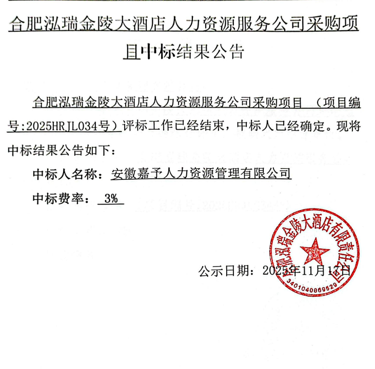 合肥泓瑞金陵大酒店人力資源服務(wù)公司采購項(xiàng)目中標(biāo)結(jié)果公告