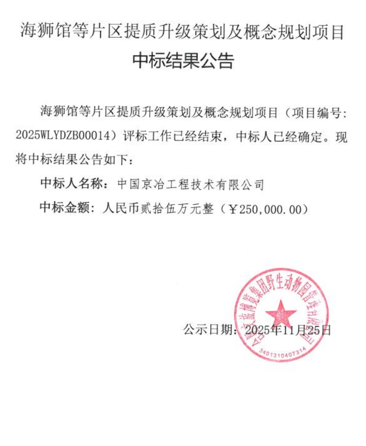 海獅館等片區(qū)提質(zhì)升級(jí)策劃及概念規(guī)劃項(xiàng)目中標(biāo)結(jié)果公告