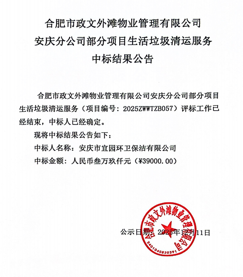 合肥市政文外灘物業(yè)管理有限公司安慶分公司部分項目生活垃圾清運服務(wù)中標(biāo)結(jié)果公告
