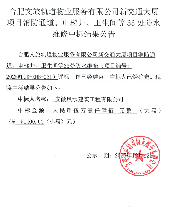 合肥文旅軌道物業(yè)服務(wù)有限公司新交通大廈項(xiàng)目消防通道、電梯井、衛(wèi)生間等33處防水維修中標(biāo)結(jié)果公告