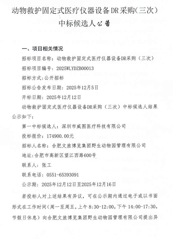 動物救護(hù)固定式醫(yī)療儀器設(shè)備 DR采購(三次)中標(biāo)候選人公告