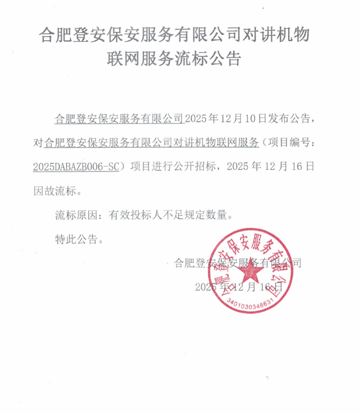 合肥登安保安服務(wù)有限公司對講機物聯(lián)網(wǎng)服務(wù)流標公告